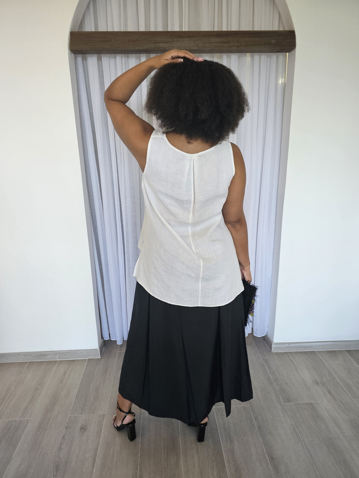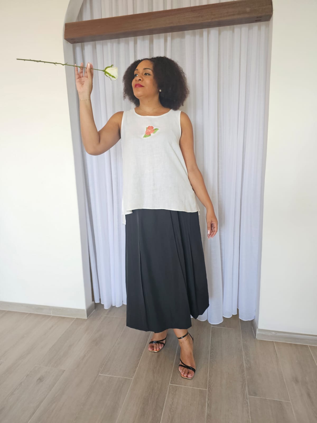 Débardeur 100% lin plus long dans le dos avec une fleur brodée sur le devant T42/44