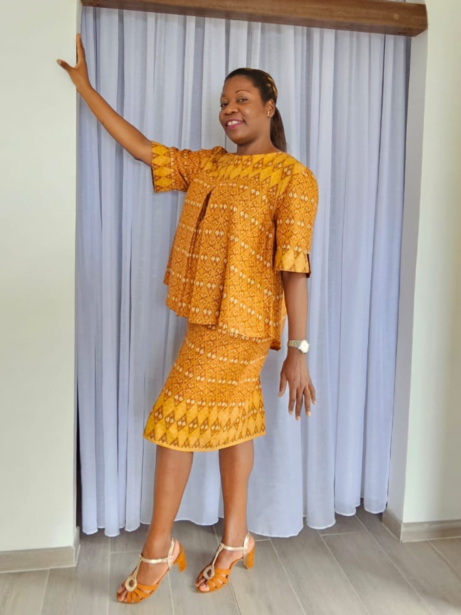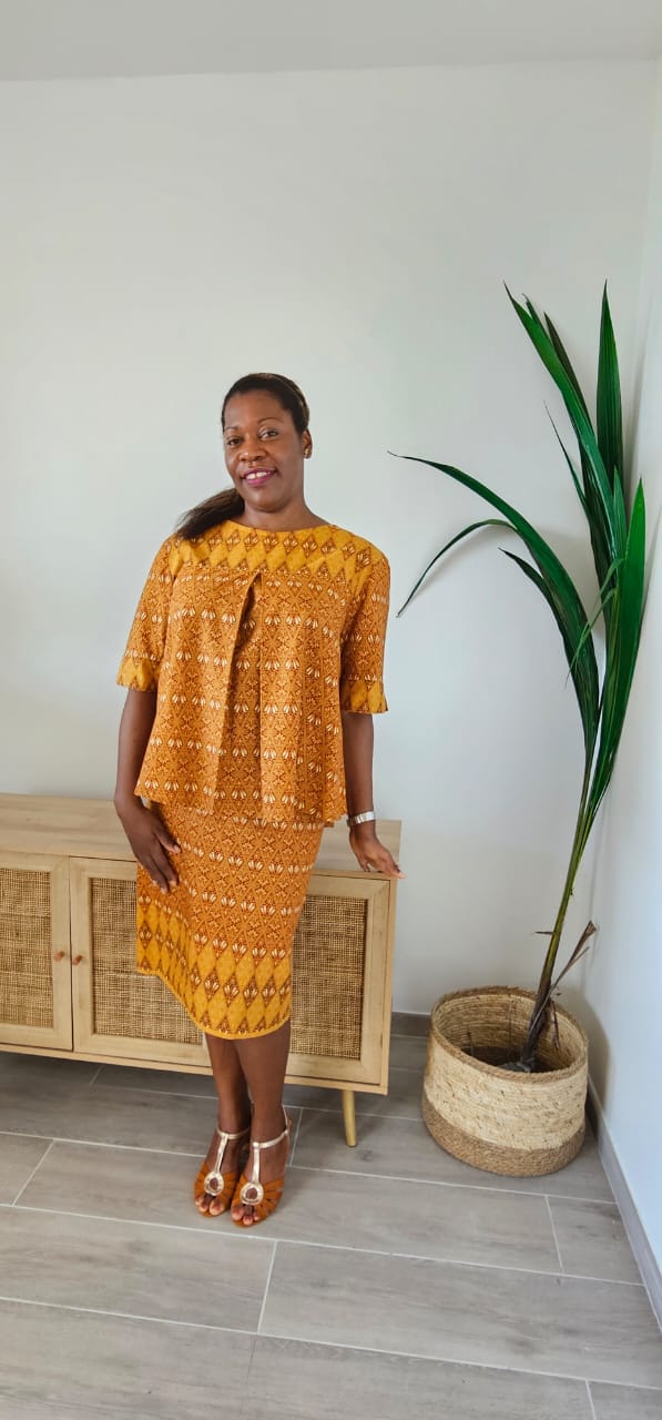 Ensemble jupe et haut en batik indonésien - haut ample - avec plis creux à l'avant et une fermeture éclaire dans le dos. T 46 - Couleur moutarde - Tour de taille: 92cm