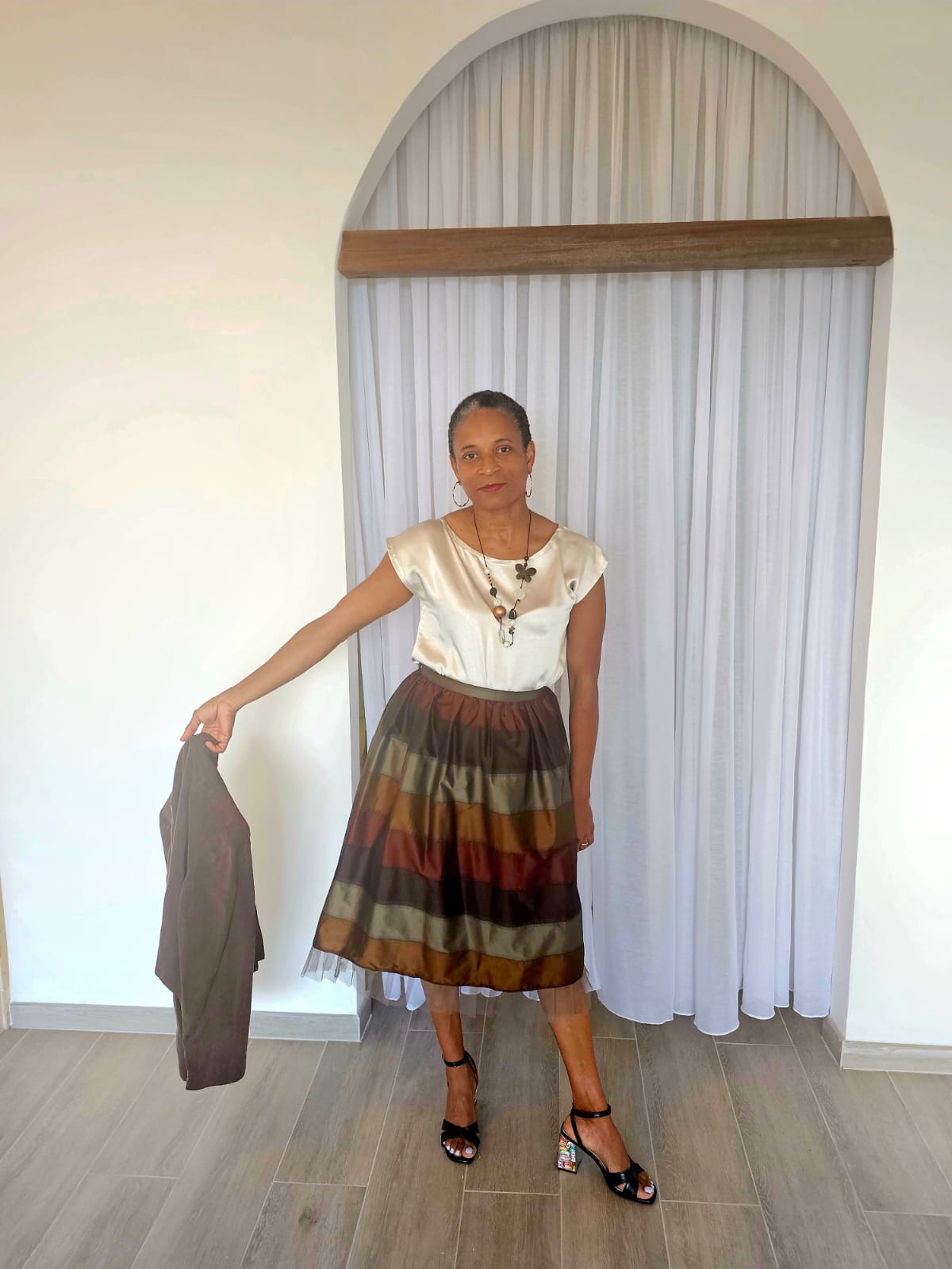 Local incarne l'essence de la sophistication avec cette ensemble composé d'une jupe en taffetas structuré agrémentée d'un volant en tulle aérien, tour de taille 75 cm, associée à un haut en crêpe de satin raffiné. Taille 40. Le taffetas offre une tenue impeccable et un tombé élégant, tandis que le tulle ajoute une dimension romantique et légère. Le crêpe de satin, matière noble aux propriétés fluides, assure confort et élégance en toute circonstance. Cet ensemble harmonieux convient parfaitement aux occasions formelles ou aux moments où vous souhaitez exprimer votre style avec distinction et finesse. (veste non incluse)